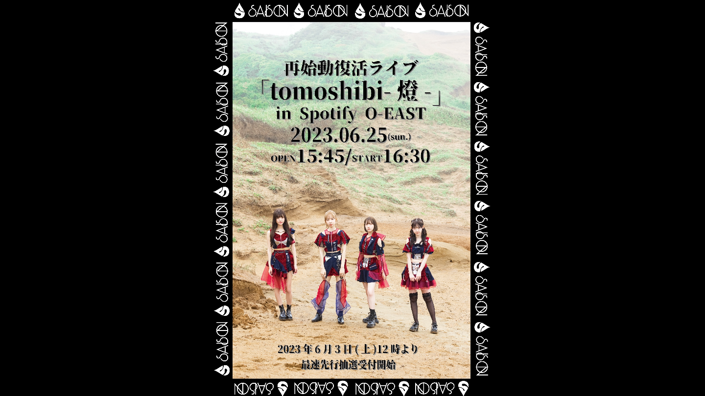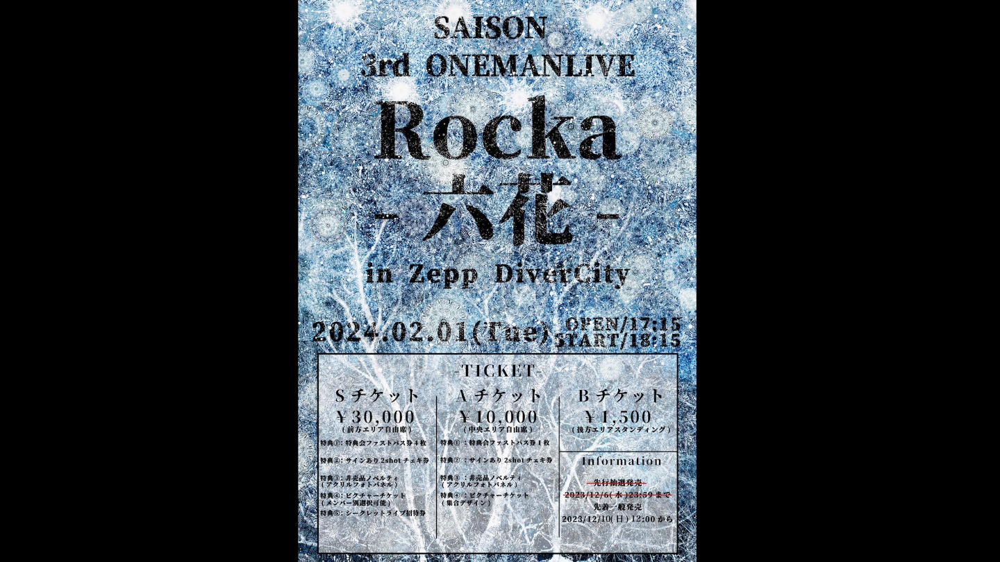 「いま、貴女に逢いにいきます」 高校生&大学生限定 応募は2025年3月10日まで 春は出会いと別れの時期です。「2025年の春」を人生の思い出の1ページにしていただきたくSAISON初の試みとして、「いま、貴女に逢いに行きます」企画を実施します。 3rd ONEMANLIVE Rocka -六花- 開催決定 Zepp DiverCity 2024年2月1日(木) SAISON3rd ONEMANLIVE「Rocka -六花-」開催決定。新体制初のワンマンライブとなります。 再始動復活ライブ開催決定 Sportify O-EAST 2023年6月25日(日) SAISON再始動復活ライブ「tomoshibi-燈-」開催決定。メンバー4名で新たなるSAISONの再出発となります。 HPを更新しました お知らせ 2023年6月1日(木) SAISON公式ホームページをリニューアルしました